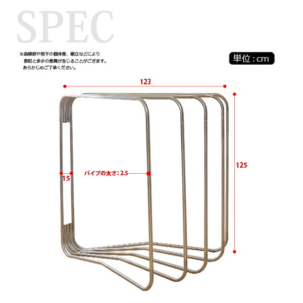 シルバー 抗菌 錆に強い サビ 屋内 野外 屋外 室内 室外 耐荷重50仕様詳細サイズ/重量幅123 x 奥行15 x 高さ125cm (パイプ径2.5cm) / 約6kg梱包サイズ幅130 x 奥行24 x 高さ13cm材質ステンレス耐荷重パイプ1本当たり10kg生産国中国その他注意事項・風の強い日は使用しないでください。